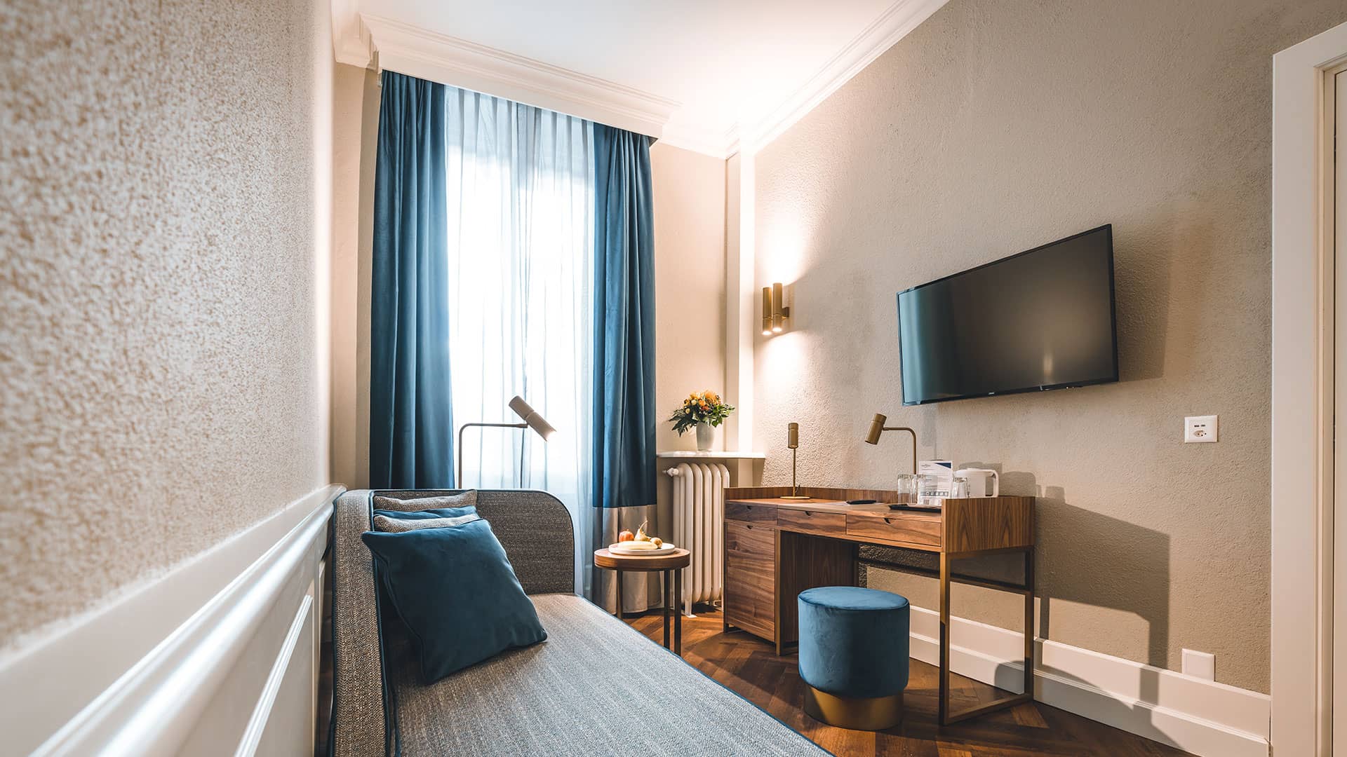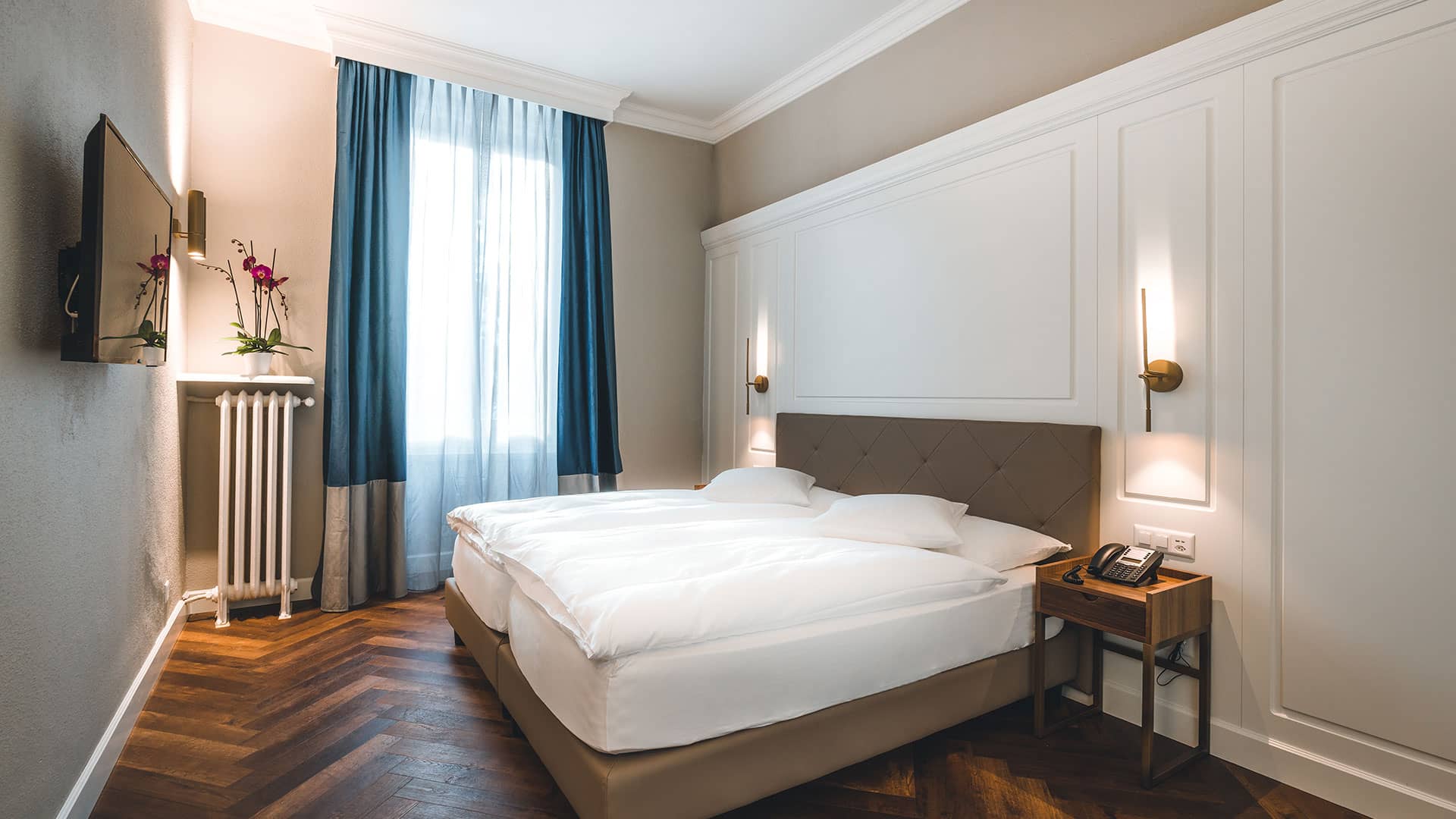 Entspannen und wohlfühlen: Den ersten Eindruck prägt der stilvolle und funktionale Wohnraum mit Récamière und grossem begehbaren Kleiderschrank. Das Schlafzimmer mit Badezimmer en suite überzeugt durch eine unaufdringlich royale Atmosphäre. Belle Etage Deluxe ist als Doppel- oder Zweibettzimmer verfügbar.